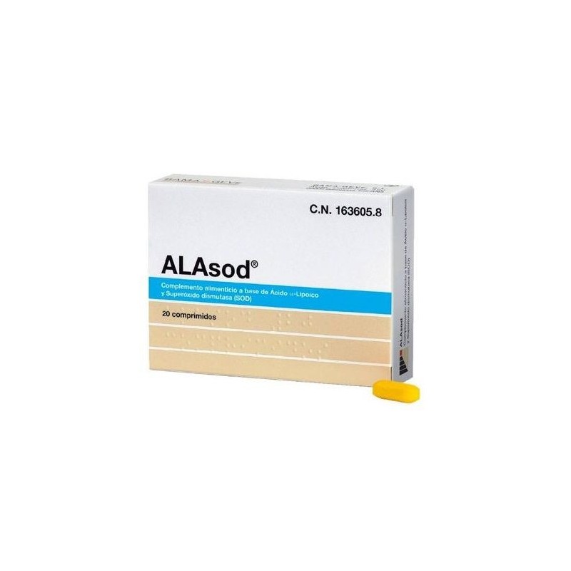 PROPIEDADESALASODES UN COMPLEMENTO ALIMENTICIO A BASE DE ÁCIDO Α-LIPOICO Y SUPERÓXIDO DISMUTASA.ELÁCIDOΑ-LIPOICOES UNA SUSTANCIA SIMILAR A LAS VITAMINAS PRODUCIDA POR EL ORGANISMO HUMANO, CONTENIDA TAMBIÉN EN NUMEROSOS ALIMENTOS. CONOCIDO POR SU DOCUMENTADA ACTIVIDAD COMO COENZIMA DEL METABOLISMO CELULAR, INTERVIENE Y PROMUEVE IMPORTANTES CICLOS METABÓLICOS COMO LA PRODUCCIÓN DE ATP.EL ÁCIDO Α-LIPOICO ES ADEMÁS UN POTENTE ANTIOXIDANTE FISIOLÓGICO, QUE CONTRARRESTA Y REDUCE LAS CONSECUENCIAS DE LOS RADICALES LIBRES, CONSIDERADOS UNO DE LOS FACTORES MÁS DAÑINOS PARA LA INTEGRIDAD Y FUNCIONALIDAD DE LOS TEJIDOS, CON LA CONSIGUIENTE DISMINUCIÓN DE LA PEROXIDACIÓN DE LOS CONSTITUYENTES LIPÍDICOS DE LAS MEMBRANAS CELULARES, ENVEJECIMIENTO Y PREDISPOSICIÓN A DESARROLLAR PATOLOGÍAS. ASIMISMO, PROMUEVE LA REGENERACIÓN DE OTROS ANTIOXIDANTES COMO LA VITAMINA E, LA VITAMINA C Y EL GLUTATIÓN.LASUPERÓXIDO DISMUTASA (SOD), UNO DE LOS ENZIMAS PRINCIPALES DEL SISTEMA ANTIOXIDANTE CELULAR, TIENE UN PAPEL FUNDAMENTAL EN EL PROCESO ANTIOXIDANTE, PREVINIENDO LA FORMACIÓN DE LOS RADICALES LIBRES, SOBRETODO DE LAS ESPECIES REACTIVAS DE OXÍGENO (ERO). LA SUPERÓXIDO DISMUTASA ES EL PRIMER SISTEMA DE DEFENSA CONTRA LOS DAÑOS CAUSADOS POR LAS ESPECIES REACTIVAS DE OXÍGENO, CUYA PELIGROSIDAD RECAE EN EL DAÑO QUE PUEDEN CAUSAR SOBRE IMPORTANTES COMPONENTES CELULARES (LÍPIDOS, PROTEÍNAS, ADN).LA PRESENCIA CONJUNTA DE ÁCIDO Α-LIPOICO Y SUPERÓXIDO DISMUTASA PERMITE UNA DOBLE ACCIÓN EN EL MECANISMO ANTIOXIDANTE DEL ORGANISMO: LASUPERÓXIDO DISMUTASAPREVIENE LA FORMACIÓN DE LOS RADICALES LIBRES Y ELÁCIDOΑ-LIPOICOFAVORECE LA ELIMINACIÓN DE LOS RADICALES LIBRES YA FORMADOS.TODOS LOS COMPONENTES DEALASODCONTRIBUYEN A CREAR UN PRODUCTO CON UNA POTENTE ACCIÓN ANTIOXIDANTE, IMPORTANTE PARA CONTRARRESTAR LAS CONSECUENCIAS DEL ESTRÉS OXIDATIVO.ALASODSE PROPONE COMO COADYUVANTE EN SITUACIONES DE ESTRÉS OXIDATIVO DEBIDAS A UN AUMENTO DE LOS RADICALES LIBRES, QUE REQUIEREN DE UN MAYOR APORTE DE ANTIOXIDANTES.MODO DE EMPLEOSE ACONSEJA TOMAR 1 COMPRIMIDO AL DÍA PREFERIBLEMENTE CON LA COMIDA PRINCIPAL.ADVERTENCIASCONSERVAR EN LUGAR FRESCO Y SECO, Y PROTEGIDO DE LA LUZ. MANTENER FUERA DEL ALCANCE DE LOS NIÑOS MÁS PEQUEÑOS.NO SUPERAR LA DOSIS DIARIA EXPRESAMENTE RECOMENDADA.LOS COMPLEMENTOS ALIMENTICIOS NO DEBEN UTILIZARSE COMO SUSTITUTOS DE UNA DIETA EQUILIBRADA.