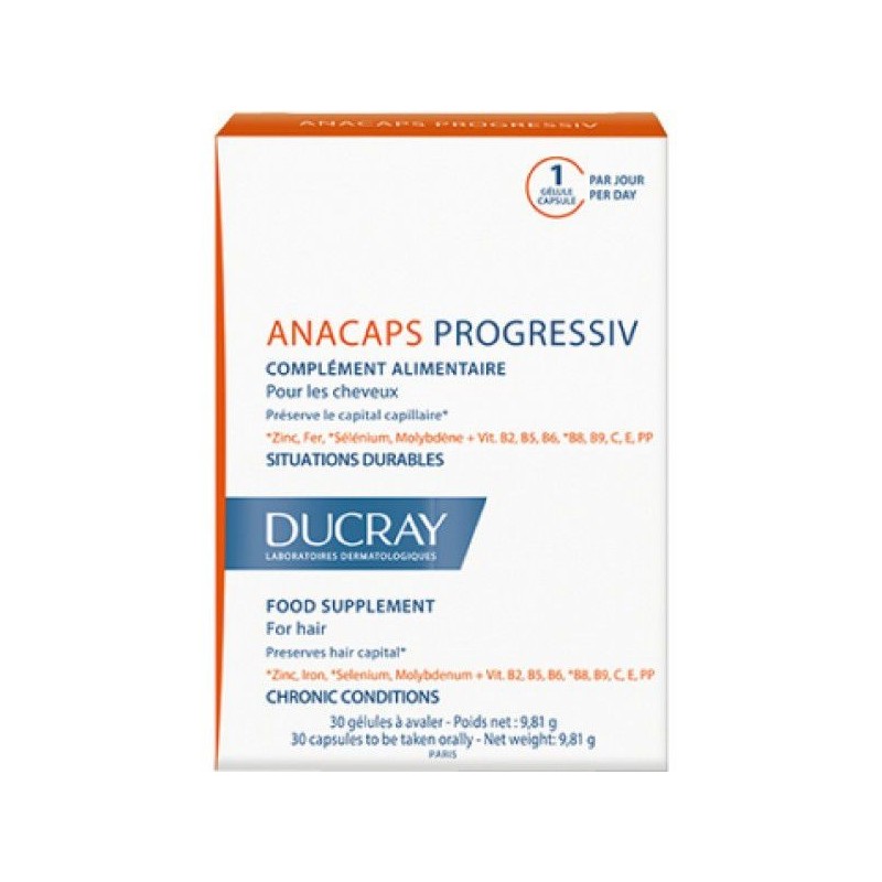 DUCRAY ANACAPS PROGRESSIV SITUACIONES CRÓNICAS HOMBES Y MUJERES 3X30CÁPSULAS:- COMPLEMENTO ALIMENTICIO.- APORTA VITAMINA B6.- PROTEGE LAS CÉLULAS FRENTE AL ESTRÉS OXIDATIVO.