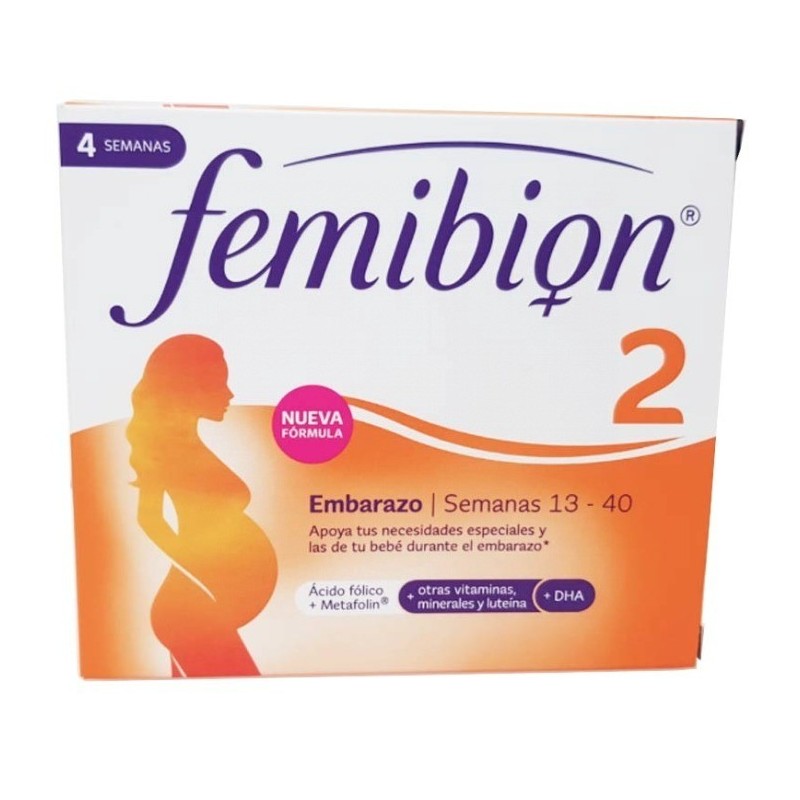 NUEVA FÓRMULA CON INGREDIENTES SELECCIONADOS, COMO EL HIERRO Y LA LUTEÍNA ENTRE OTROS, PERO SOBRE TODO EL ÁCIDO FÓLICO (+ METAFOLIN) Y EL DHA, UN ÁCIDO OMEGA-3 QUE TE AYUDA EN TU EMBARAZO DESDE LA SEMANA 13 HASTA LA 40.DESARROLLADO PARA APOYAR TUS NECESIDADES ESPECIALES Y LAS DE TU BEBÉ DESDE LA SEMANA 13 DEL EMBARAZO HASTA EL NACIMIENTO, COMO COMPLEMENTO DE UNA DIETA VARIADA.A PARTIR DE LA SEMANA 13 DEL EMBARAZO, TU BEBÉ EMPIEZA UNA INCREÍBLE FASE DE CRECIMIENTO. EN ESTE PUNTO, TE RECOMENDAMOS CAMBIAR A FEMIBION 2.ESTE COMPLEMENTO ALIMENTICIO TE PROPORCIONA FOLATOS Y DHA. EL FOLATO SIGUE SIENDO IMPORTANTE EN UNA ETAPA MÁS TARDÍA DEL EMBARAZO, YA QUE CONTRIBUYE AL CRECIMIENTO DE LOS TEJIDOS MATERNOS DURANTE EL EMBARAZO, INCLUYENDO LA FORMACIÓN DE LA PLACENTA. LA PLACENTA PROPORCIONA AL BEBÉ TODOS LOS NUTRIENTES. POR LO TANTO, SE DEBE TENER CUIDADO DE TENER UNA INGESTA ADECUADA DE FOLATO DURANTE TODO EL EMBARAZO.ADEMÁS DE LOS FOLATOS Y EL DHA, CONTIENE OTROS INGREDIENTES CUIDADOSAMENTE SELECCIONADOS: 10 VITAMINAS, INCLUYENDO VITAMINA D, YODO, Y TAMBIÉN HIERRO, SELENIO, MAGNESIO, ZINC Y LUTEÍNA.INCLUYE EN UNA CÁPSULA ADICIONAL, LUTEÍNA Y EL ÁCIDO GRASO OMEGA-3 DHA.MODO DE EMPLEOTOMAR 1 COMPRIMIDO Y 1 CÁPSULA AL DÍA CON SUFICIENTE AGUA, PREFERIBLEMENTE JUNTO CON LA COMIDA.