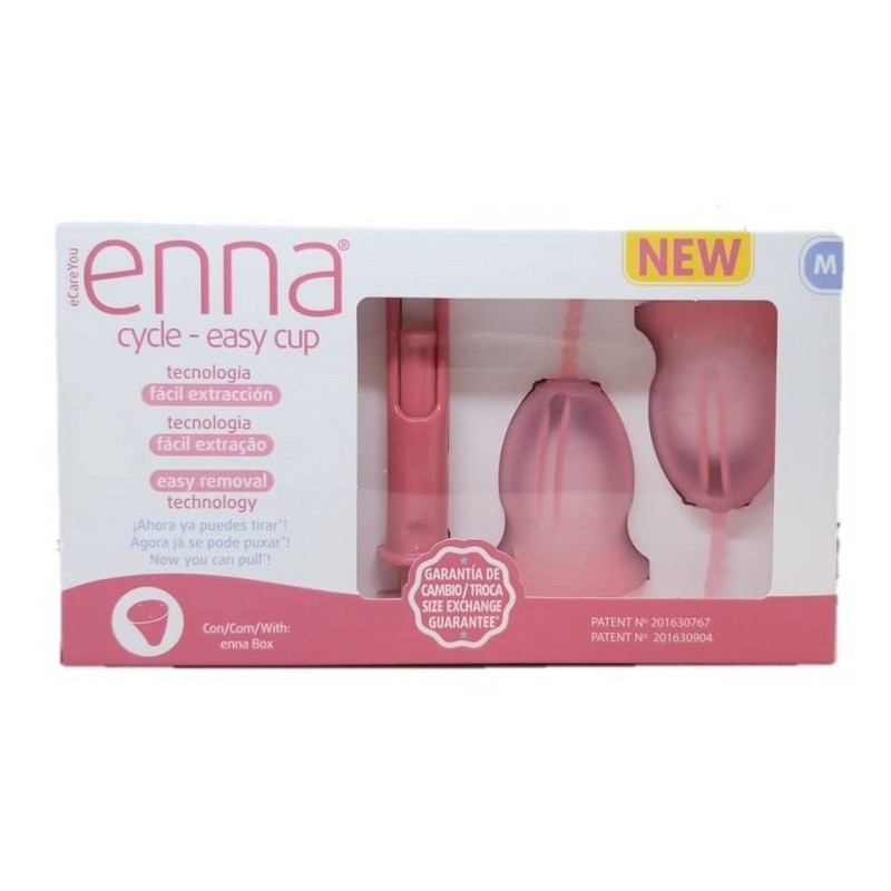 LA COPA MENSTRUAL QUE TE LO PONE FÁCIL: AHORA NO HACE FALTA QUE ROMPAS EL VACÍO, LA COPA LO ROMPE SÓLO ESTIRANDO DE SUS BOLAS. SIN MIEDO A HACERTE DAÑO, SIN DUDAS DE SI SABRÁS QUITÁRTELA. SI ALGUNA VEZ HAS TENIDO DUAS SOBRE SI SABRÍAS USAR LA COPA, ENNA CYCLE EASY CUP TE LAS DESPEJA TODAS: CON APLICADOR PARA AYUDARTE A INSERTARLA Y SISTEMA DE FÁCIL EXTRACCIÓN. ¿POR QUÉ ES REVOLUCIONARIA ENNA CYCLE EASY CUP?APLICADOR*2 COPAS MENSTRUALES DE FÁCIL EXTRACCIÓNCAJA ESTERILIZADORAENNA CYCLE ESTÁ FABRICADA EN ESPAÑA CON SILICONA LÍQUIDA DE GRADO MÉDICO, TOTALMENTE COMPATIBLE CON EL ORGANISMO YA QUE NO GENERA NINGUNA REACCIÓN ADVERSA.LIBRE DE SUSTANCIAS QUÍMICAS.ENNA CYCLE EASY CUP ESTÁ INDICADA CUANDO:EL SUELO PÉLVICO ESTÁ FUERTE, MUJERES JÓVENES. SE LLEVAN A CABO PRÁCTICAS DEPORTIVAS QUE FORTALECEN EL SUELO PÉLVICO.EXISTEN DIFICULTADES PARA EXTRAER LA COPA MENSTRUAL. SE SIENTE INCOMODIDAD AL MANIPULAR LA ZONA GENITAL. LA COPA MENSTRUAL ES UN RECIPIENTE QUE SE INSERTA EN LA VAGINA DURANTE LA MENSTRUACIÓN PARA DEPOSITAR EL FLUJO MENSTRUAL. HASTA AHORA, PARA VACIAR LA COPA MENSTRUAL DEBÍAS ALCANZAR LA BASE Y PELLIZCARLA PARA ROMPER EL VACÍO, AHORA ES MUCHO MÁS FÁCIL CON ENNA CYCLE EASY CUP, LA COPA DE FÁCIL EXTRACCIÓN.