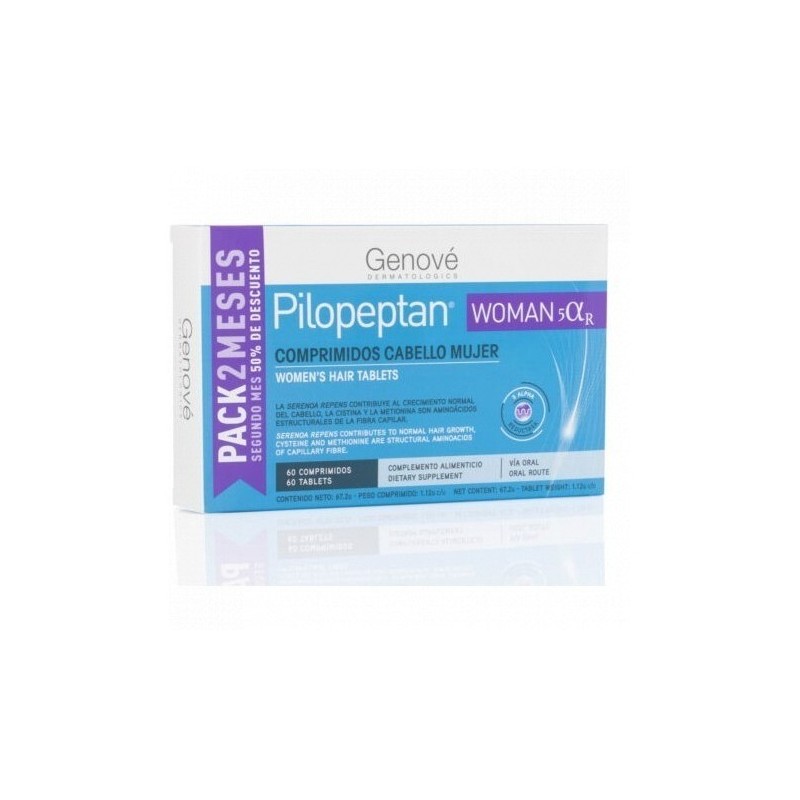 Pilopeptan woman 50r de genové dermatologics está formulado específicamente para cubrir las necesidades nutricionales del cabello femenino. Contiene vitaminas, minerales, aminoácidos y antioxidantes que contribuyen al crecimiento normal del cabello, protegen frente al daño oxidativo y fortalecen la estructura capilar. Este complemento está especialmente indicado en casos de caída, fragilidad, falta de densidad o situaciones en las que el cabello necesita un aporte extra de nutrientes (cambios hormonales, estrés, dietas, postparto…). Su fórmula avanzada ayuda a: favorecer el crecimiento saludable del cabello. Mantener la fortaleza y brillo natural. Proteger frente a radicales libres y envejecimiento capilar. Formato pack 2 meses (60 comprimidos) con descuento en la segunda unidad. Vía oral | complemento alimenticio | uso diario.