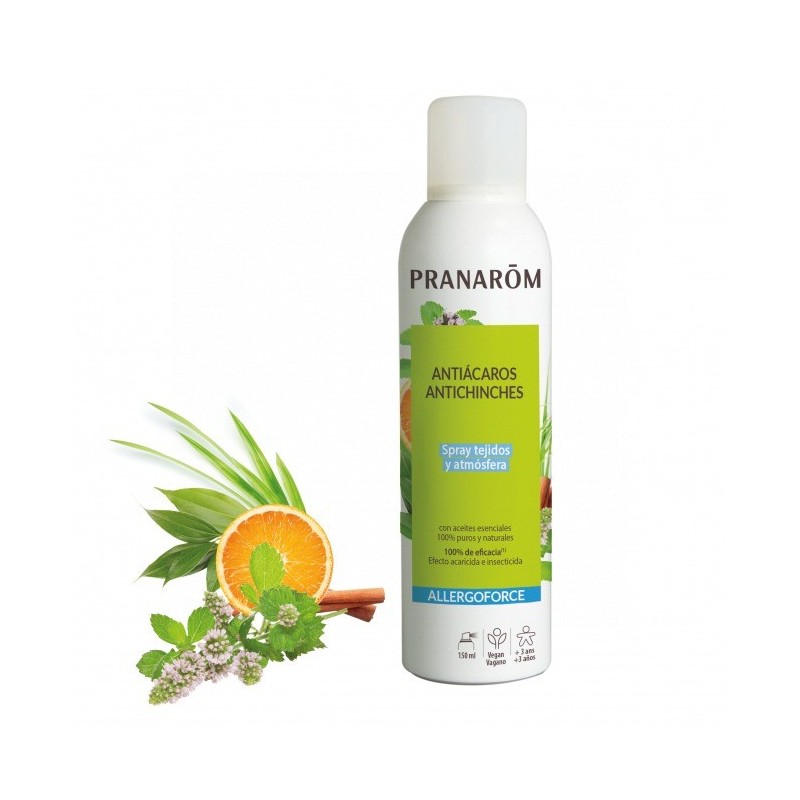 SPRAY TEJIDOS Y ATMÓSFERA ALLERGOFORCE. COLCHÓN, EDREDÓN, ALMOHADA, PELUCHE, ALFOMBRA, CORTINAS ...FÓRMULA EFICAZ Y NATURAL PARA ELIMINAR LOS ÁCAROS Y LAS CHINCHES.REDUCE LAS FUENTES DE ALERGIA Y SUS SÍNTOMAS (NARIZ CONGESTIONADA, OJOS LLOROSOS, ETC.)EFICACIA PROBADA: ESTUDIOS PRANARÔM.- EFECTO ACARICIDA EN 8 HORAS?:100% DE LOS ÁCAROS ELIMINADOS (ADULTOS, LARVAS Y HUEVOS) (DERMATOPHAGOIDES PTERONYSSINUS). DURACIÓN DE LA ACCIÓN?: 1 MES.- EFECTO INSECTICIDA EN 24 HORAS:100% DE LAS CHINCHES DE CAMA ELIMINADAS (ADULTOS Y LARVAS) (CIMEX LECTULARIUS). DURACIÓN DE LA ACCIÓN: 5 DÍAS.DOSIFICACIÓNSPRAY LISTO PARA USAR.• EN CUALQUIER TEJIDO : COLCHÓN, EDREDÓN, ALMOHADA, PELUCHE, ALFOMBRA, CORTINAS,…• PARA LOS ÁCAROS: PULVERIZAR A 30 CM DURANTE UNOS SEGUNDOS (10 A 15 SEG PARA UN COLCHÓN, POR EJEMPLO). SALIR DE LA HABITACIÓN Y, 8 HORAS DESPUÉS, PASAR EL ASPIRADOR Y VENTILAR DURANTE AL MENOS 30 MINUTOS ANTES DE ACOSTARSE.150 ML DE ESTE PRODUCTO PERMITEN TRATAR UNA SUPERFICIE DE 15M² DE TEJIDO.• PARA LAS CHINCHES DE CAMA: PULVERIZAR A 30 CM DURANTE UNOS SEGUNDOS EN LOS LUGARES INFESTADOS. SALIR DE LA HABITACIÓN Y, 8 HORAS DESPUÉS, VENTILAR DURANTE AL MENOS 30 MINUTOS ANTES DE ACOSTARSE. A LAS 24 HORAS, PASAR EL ASPIRADOR.REPETIR LA OPERACIÓN EN LOS 2 CASOS 1 VEZ A LA SEMANA PARA LOS MÁS ALÉRGICOS, EN CASO CONTRARIO, 1 VEZ AL MES COMO MANTENIMIENTO. COMPOSICIÓNISOPROPYL ALCOHOL, CINNAMOMUM ZEYLANICUM LEAF OIL (CANNELIER DE CEYLAN), MENTHA PIPERITA OIL (MENTHE POIVRÉE), CITRUS SINENSIS PEEL OIL EXPRESSED (ORANGE DOUCE), CYMBOPOGON CITRATUS LEAF OIL (LEMONGRASS), MELALEUCA QUINQUINERVIA OIL (NIAOULI), CYMBOPOGON GIGANTEUS OIL (CITRONNELLE DE MADAGASCAR), CINNAMOMUM CASSIA OIL (CANNELIER DE CHINE).