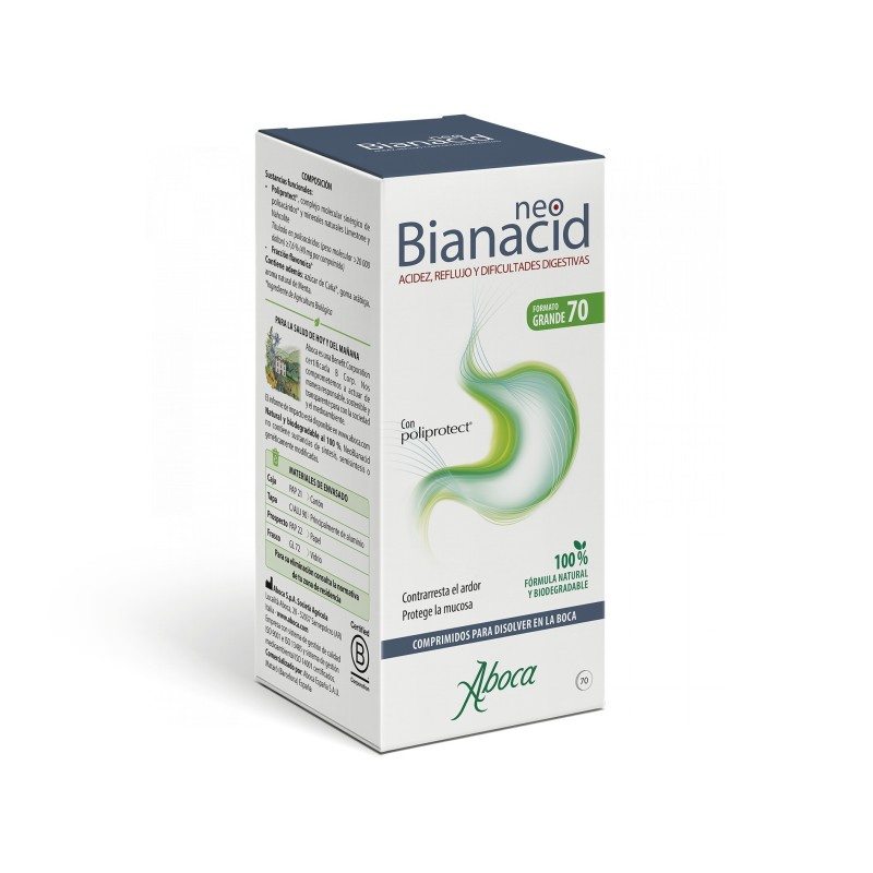NeoBianacid, gracias a su mecanismo de acción, puede utilizarse en asociación con inhibidores de la bomba de protones y antagonistas H2 y también en los periodos de suspensión del tratamiento, siguiendo las indicaciones del médico. Indicaciones: NeoBianacid está indicado para el tratamiento de los trastornos relacionados con la acidez, como ardor, dolor, reflujo gastroesofágico y gastritis. También está indicado para el tratamiento de los síntomas asociados a las dificultades digestivas, como ardor, pesadez y meteorismo. NeoBianacid puede resultar útil para la prevención de situaciones que puedan provocar irritaciones de la mucosa (administración de medicamentos antiinflamatorios/analgésicos no esteroideos, periodos de estrés psicofísico, cambios de estación, alimentación y estilo de vida inadecuados). El producto también es apto para su empleo durante el embarazo, la lactancia y para niños mayores de 6 años. Modo de empleo: tomar un comprimido según necesidad, dejándolo disolver lentamente en la boca. En caso de reflujo gastroesofágico se recomienda un comprimido