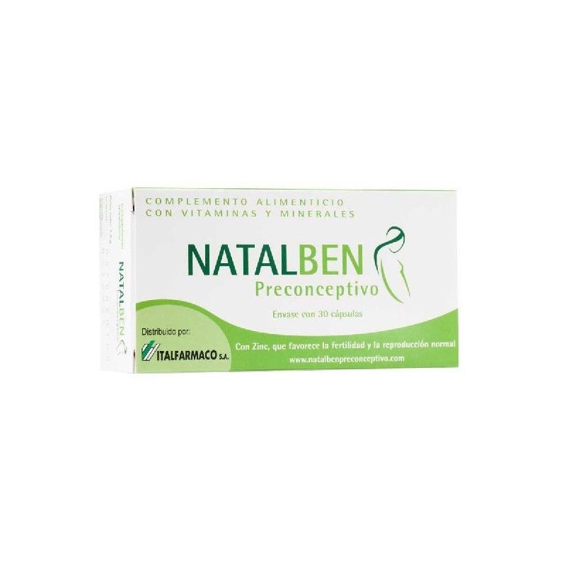 PROPIEDADESNATALBEN PRECONCEPTIVO ES UN SUPLEMENTO ALIMENTICIO PENSADO PARA MUJERES QUE QUIEREN QUEDARSE EMBARAZADAS. FAVORECE LA FERTILIDAD Y REPRODUCCIÓN NORMAL Y CONTRIBUYE A QUE EL DESARROLLO DEL FETO SEA ÓPTIMO GRACIAS AL APORTE NUTRICIONAL QUE CONTIENE SU FÓRMULA.- PARA QUIÉN: INDICADO PARA MUJERES EN EDAD FÉRTIL QUE PLANIFICAN UN EMBARAZO.- APLICACIÓN: ORAL.- TIPO DE USO: PRECONCEPTIVO.- FORMA: ENVASE CON 30 CÁPSULAS.- PRESCRIPCIÓN: SIN RECETA MÉDICA.- MARCA: NATALBEN.MODO DE EMPLEOTOMAR UNA CÁPSULA AL DÍA CON UN VASO DE AGUA.NATALBEN PRECONCEPTIVO ES UN COMPLEMENTO ALIMENTICIO QUE PUEDE TOMARSE DURANTE LARGOS PERIODOS DE TIEMPO.INDICACIONESNATALBEN PRECONCEPTIVO ES UN TRATAMIENTO PENSADO PARA TOMAR EN EL MOMENTO EN QUE UNA MUJER DECIDE QUEDARSE EMBARAZADA. LAS CÁPSULAS FAVORECEN LA CAPACIDAD DE PROCREAR DE LA MUJER Y OPTIMIZAN SU ESTADO NUTRICIONAL.