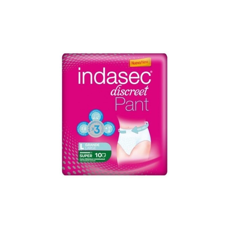 INDASEC® DISCREET PANT CON TECNOLOGÍA INVISIBLE SYSTEM SE ADAPTA MEJOR EN LA ZONA DE LA ENTREPIERNA, EVITANDO INCÓMODOS ABULTAMIENTOS. INDASEC® DISCREET PANT ES MÁS ESTRECHO. CON INDASEC PANT PODRÁS DISFRUTAR LOS MOMENTOS MÁS ESPECIALES SIN NINGUNA PREOCUPACIÓN, GRACIAS A QUE GARANTIZA LA MAYOR ABSORCIÓN Y DISCRECIÓN ADEMÁS DE CONTROL DEL OLOR.INDASEC® DISCREET PANT TAMBIÉN INCORPORA:BARRERAS TRANSVERSALES PARA EVITAR ESCAPES POR LA ESPALDA.INDICADOR DE NIVEL DE SATURACIÓN.HILOS ELÁSTICOS CURVOS PARA UN MEJOR AJUSTE A INGLES Y GLÚTEOS.