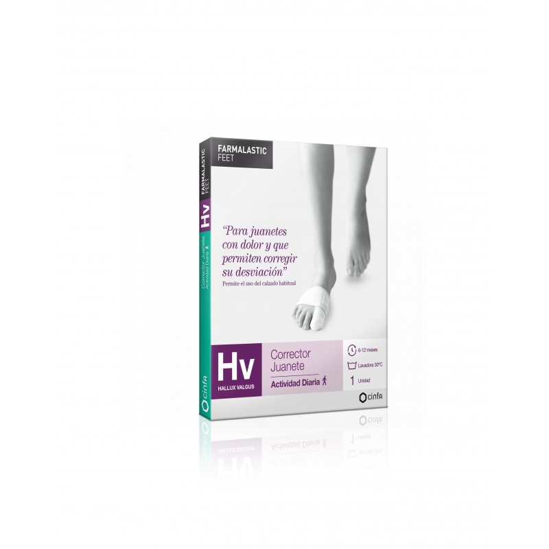 AYUDA A CORREGIR Y LIMITAR LA EVOLUCIÓN EL JUANTE (HALLUX VALGUS) Y CONTRIBUYE A ALIVIAR LOS DOLORES ARTICULARES RELACIONADOS Y LOS OCASIONADOS POR EL ROCE. EL CORRECTOR DE JUANETE, PATENTADO A DIFERENCIA DE LOS CORRECTORES RÍGIDOS, SE UTILIZA DURANTE LA JORNADA GRACIAS A SU DISEÑO FLEXIBLE Y ULTRA-FINO. REALINEA EL 1ER DEDO DEL PIE CON FORMA REGULABLE Y TAMBIÉN EL 1ER METATARSIANO, A LA VEZ QUE AYUDA A ALIVIAR EL DOLOR, TANTO ARTICULAR COMO POR ROCE. LLEVÁNDOLO A DIARIO CON CUALQUIER TIPO DE CALZADO, NO SÓLO CORRIGE Y AYUDA A ALIVIAR EL DOLOR, TAMBIÉN LIMITA LA PROGRESIÓN DEL JUANETE. SILICONA 58%, POLIAMIDA/ELASTANO 42%. PRODUCTO SANITARIO. CLASE I.MODO DE EMPLEOESTE PRODUCTO ES PARA USO DIURNO, ACTÚA DINÁMICAMENTE DURANTE LA MARCHA Y ES EFICAZ CUANDO SE UTILIZA DE FORMA CONTINUADA. PUEDE UTILIZARSE INDISTINTAMENTE EN EL PIE DERECHO O IZQUIERDO. PASAR EL EMPEINE POR LA BANDA. ENCAPUCHAR EL PRIMER DEDO, QUE LA PASTILLA DE SILICONA MÁS GRUESA QUEDE DETRÁS DEL JUANETE. AJUSTAR LA TENSIÓN SOBRE EL DEDO TIRANDO CON SUAVIDAD DE LA BANDA HACIA EL TOBILLO, EL 1ER DÍA TENSIONAR POCO Y AUMENTAR HASTA LLEGAR AL MÁXIMO A LOS 10 DÍAS.PRECAUCIONES Y ADVERTENCIASNO UTILIZAR SI EL 1ER DEDO DEL PIE YA NO PUEDE MOVERSE LATERALMENTE. NO UTILIZAR EN CASO DE PRESENTAR ALERGIA A ALGUNO DE LOS MATERIALES QUE LA COMPONEN NI SOBRE HERIDAS ABIERTAS. EN PERSONAS QUE PADEZCAN DIABETES, ARTERITIS, POLINEURITIS, NEUROPATÍA DE LOS MIEMBROS INFERIORES O ÚLCERAS VARICOSAS, CONSULTAR CON SU MÉDICO Y VIGILAR DURANTE LA UTILIZACIÓN.CONSERVACIÓN Y CADUCIDADLAVAR A MANO SIN FROTAR O A MÁQUINA (MÁX. 30º) UTILIZANDO LA BOLSA DE LAVADO ADJUNTA. AL SECAR NO EXPONER AL SOL, RADIADORES NI CUALQUIER OTRA FUENTE DE CALOR. NO PLANCHAR. EL CONTACTO DE LA PRENDA CON CREMAS O ACEITES DETERIORA LAS FIBRAS HACIÉNDOLAS MENOS ELÁSTICAS Y MÁS DÉBILES.