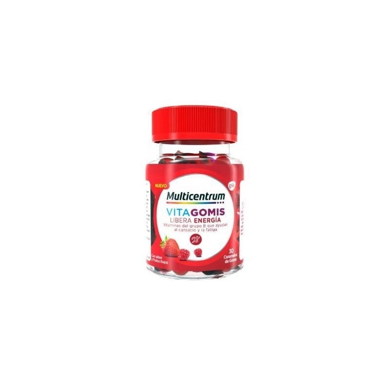DISFRUTA DE LO BUENO CADA DÍA CON MULTICENTRUM VITAGOMIS LIBERA ENERGÍA. GOMINOLAS CON VITAMINAS B6 Y B12 PARA AYUDAR A DISMINUIR EL CANSANCIO Y LA FATIGA.MULTICENTRUM VITAGOMIS LIBERA ENERGÍA TE PROPORCIONA UNA FÓRMULA EQUILIBRADA DE VITAMINAS Y MINERALES, EN UNA GOMINOLA CON SABOR A FRUTOS ROJOS.FÓRMULA CON 5 VITAMINAS ESENCIALES PARA ADULTOS A PARTIR DE 18 AÑOS.CONTIENE VITAMINA B6, B12 Y NIACINA QUE CONTRIBUYEN AL METABOLISMO ENERGÉTICO NORMAL.APOYA EL BIENESTAR GENERAL DE LOS ADULTOS. UN COMPLEMENTO QUE APOYA TU DIETA CON MICRONUTRIENTES DE ALTA CALIDAD.TOME DOS CARAMELOS DE GOMA AL DÍA.MSATICAR HASTA QUE SE DESHAGA, SE PUEDE TOMAR SIN COMIDA NI AGUA.SI ESTÁ EMBARAZADA O EN PERIODO DE LACTANCIA, DEBERÍA CONSULTAR CON SU MÉDICO O FARMACÉUTICO ANTES DE EMPEZAR A TOMAR ESTE PRODUCTO.VITAMINA DLA VITAMINA D (CALCIFEROL) CONTRIBUYE AL MANTENIMIENTO DE UN SISTEMA INMUNITARIO SALUDABLE. ADEMÁS, LA VITAMINA D CONTRIBUYE AL MANTENIMIENTO DE LOS HUESOS Y LOS DIENTES, ASÍ COMO A UNA FUNCIÓN MUSCULAR NORMAL.B12VITAMINA B12LA VITAMINA B12 AYUDA A DISMINUIR EL CANSANCIO Y LA FATIGA, ASÍ COMO A LA PRODUCCIÓN NORMAL DE GLÓBULOS ROJOS.B6VITAMINA B6LA VITAMINA B6 CONTRIBUYE AL FUNCIONAMIENTO NORMAL DEL SISTEMA NERVIOSO, AL METABOLISMO ENERGÉTICO NORMAL Y AYUDA A DISMINUIR EL CANSANCIO Y LA FATIGA.B3NIACINALA NIACINA CONTRIBUYE AL METABOLISMO ENERGÉTICO NORMAL, AYUDA A DISMINUIR EL CANSANCIO Y LA FATIGA, ASÍ COMO AL FUNCIONAMIENTO NORMAL DEL SISTEMA NERVIOSO.