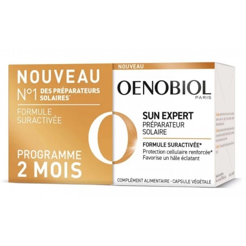 Oenobiol Sun Expert Preparador Solar para Piel Sensible es un complemento alimenticio formulado para pieles sensibles al sol. Su fórmula sobreactivada y con protección celular reforzada favorece un bronceado radiante y una preparación óptima antes de la exposición solar. Cada caja contiene 2 frascos de 30 cápsulas, con un peso neto total de 35.4 g.