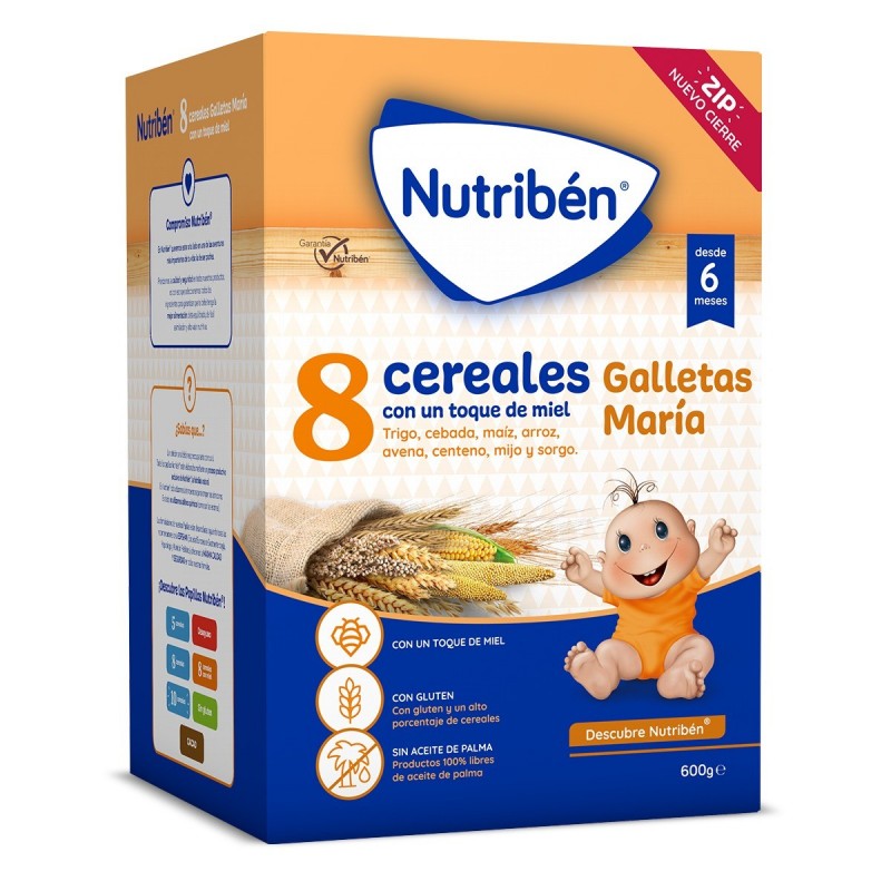 NUTRIBÉN PAPILLA 8 CEREALES CON UN TOQUE DE MIEL GALLETAS MARÍA ES UNA PAPILLA DE CEREALES CON UN TOQUE DE MIEL Y 4 FRUTAS, ELABORADA PARA ASEGURAR LA ALIMENTACIÓN DEL BEBÉ A PARTIR DE LOS 6 MESES. ES UNA PAPILLA INSTANTÁNEA IDEAL PARA DIVERSIFICAR LA DIETA DEL BEBÉ, SIEMPRE MANTENIENDO UNA DIETA EQUILIBRADA.NUTRIBÉN PAPILLA 8 CEREALES CON UN TOQUE DE MIEL GALLETAS MARÍA ESTÁ DESARROLLADA CON UN PROCESO PRODUCTIVO NATURAL QUE NO INCLUYE NINGÚN PROCESO QUÍMICO, CONSIGUIENDO ASÍ QUE TENGA UNA MENOR CONCENTRACIÓN DE AZÚCARES Y CONSERVANDO EL SABOR AUTÉNTICO DE LOS CEREALES.INGREDIENTES A BASE DE CEREALES 62 % (HARINA (TRIGO, CEBADA, ARROZ, AVENA, CENTENO, MIJO Y SORGO), MALTODEXTRINA DE MAÍZ Y ALMIDÓN DE MAÍZ).AZÚCAR.GALLETAS MARÍA 12% (HARINA DE TRIGO, AZÚCAR, ALMIDÓN DE TRIGO, ACEITES VEGETALES (GIRASOL Y OLIVA), EXTRACTO DE MALTA, GASIFCANTES ( BICARBONATO AMÓNICO, BICARBONATO SÓDICO), EMULGENTE (LECITNA DE GIRASOL), AGENTE DE TRATAMIENTO DE LA HARINA (L-CISTEÍNA) Y ANTOXIDANTE (EXTRACTO RICO EN TOCOFEROLES).MIEL 6%.MINERALES (CALCIO Y FÓSFORO).VITAMINAS (C, NIACINA, E, ÁCIDO PANTOTÉNICO, B1, B6, A, ÁCIDO FÓLICO, K1, BIOTNA Y D3).AROMA (VAINILLINA).PUEDE CONTENER TRAZAS DE LECHE, SOJA Y FRUTOS DE CÁSCARA.