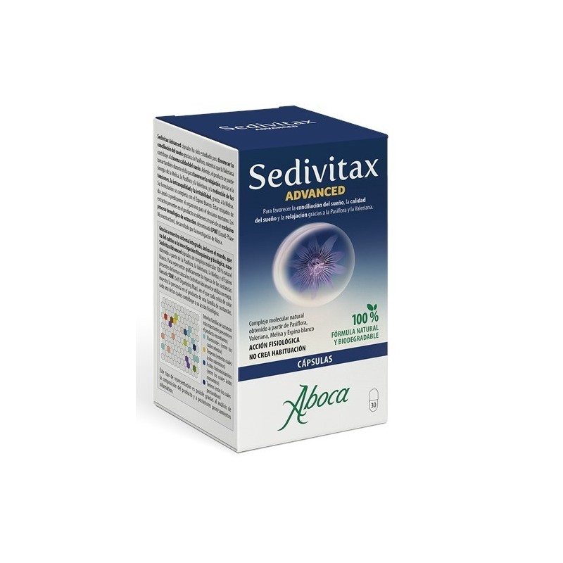 SEDIVITAX ADVANCED CÁPSULAS HA SIDO ESTUDIADO PARA FAVORECER LA CONCILIACIÓN DEL SUEÑO GRACIAS A LA PASIFLORA, MIENTRAS QUE LA VALERIANA CONTRIBUYE A LA BUENA CALIDAD DEL SUEÑO.ADEMÁS, EL PRODUCTO SE PUEDE TOMAR TAMBIÉN DURANTE EL DÍA PARA FAVORECER LA RELAJACIÓN, GRACIAS A LA SINERGIA DE LA MELISA, LA PASIFLORA Y LA VALERIANA, Y LA REDUCCIÓN DE LAS TENSIONES, LA INTRANQUILIDAD Y LA IRRITABILIDAD, GRACIAS A LA MELISA.SU FORMULACIÓN SE COMPLETA CON EL ESPINO BLANCO.ESTAR RELAJADOS DE DÍA AYUDA A PREDISPONER EL ORGANISMO PARA EL DESCANSO NOCTURNO.LOS EXTRACTOS PRESENTES EN EL PRODUCTO SE OBTIENEN A TRAVÉS DE UN EXCLUSIVO PROCESO TECNOLÓGICO DE EXTRACCIÓN, DENOMINADO LPME (LIQUID-PHASE MICROEXTRACTION), DESARROLLADO POR LA INVESTIGACIÓN DE ABOCA.SE ACONSEJA TOMAR: 2 O 3 CÁPSULAS POR LA NOCHE PARA FACILITAR EL SUEÑO Y MEJORAR SU CALIDAD,EN CASO DE NECESIDAD, 1 CÁPSULA POR LA MAÑANA PARA FAVORECER LA RELAJACIÓN DURANTE EL DÍA.SU EFECTO VARÍA DEPENDIENDO DE LA SENSIBILIDAD INDIVIDUAL, POR LO QUE SE ACONSEJA EMPEZAR TOMANDO LA DOSIS MÍNIMA DIARIA Y AUMENTARLA BASÁNDOSE EN LAS PROPIAS NECESIDADES.NO SUPERAR LAS DOSIS RECOMENDADAS. LOS COMPLEMENTOS ALIMENTICIOS NO PUEDEN CONSIDERARSE UN SUSTITUTO DE UNA DIETA VARIADA Y EQUILIBRADA Y DEBEN SER UTILIZADOS EN EL ÁMBITO DE UN ESTILO DE VIDA SANO. MANTENER EL PRODUCTO FUERA DEL ALCANCE DE LOS NIÑOS MÁS PEQUEÑOS.