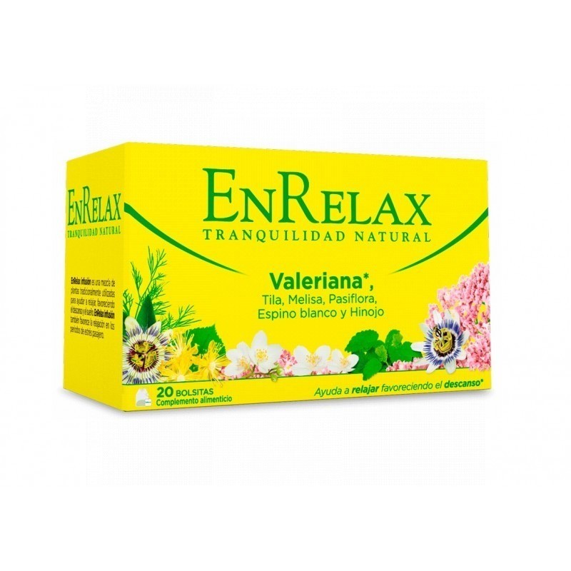 INFUSIÓN ENRELAX:- AYUDA A LA RELAJACIÓN Y A OLVIDAR EL ESTRÉS.- FAVORECE EL DESCANSO DURANTE LA NOCHE.- FORMULADO CON VALERIANA, PASIFLORA Y ESPINO BLANCO.